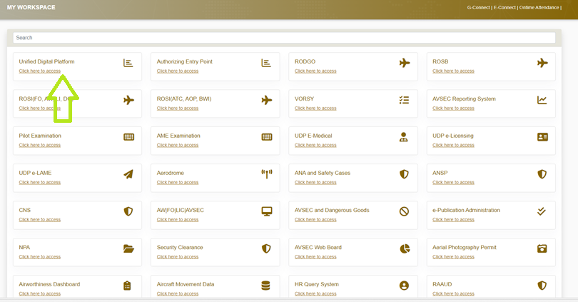 Once you click on e-Service a new page will open containing all the back office GCAA System Links. Click on “Unified Digital Platform” to open UDP Dashboard.