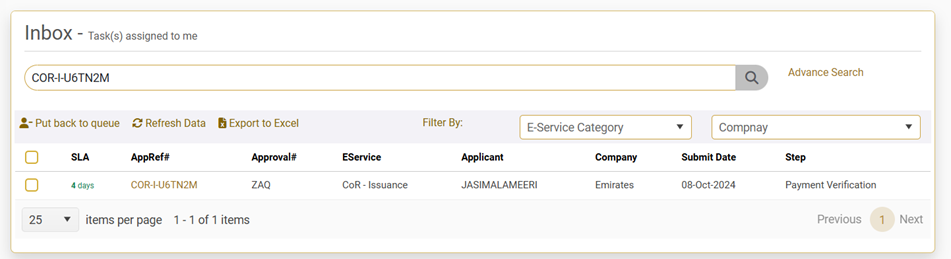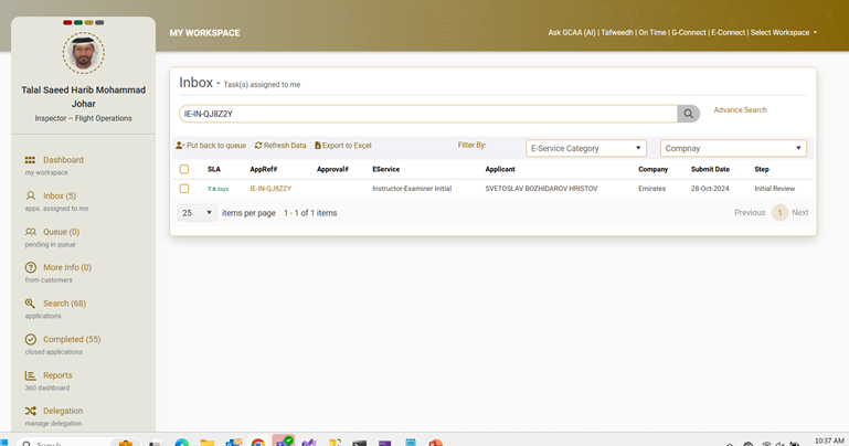 Once the GCAA Employee click on “Assign to me” the application will be assigned to inspector and will be available in “Inbox” to process.