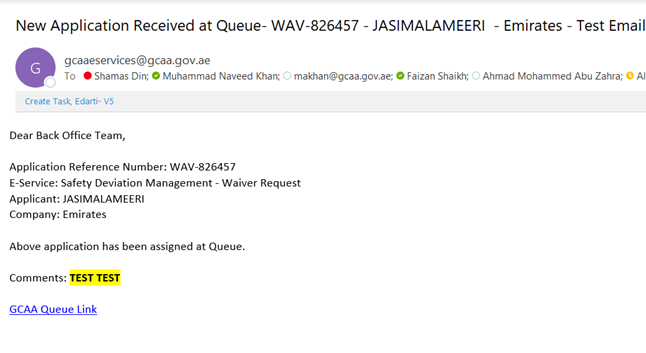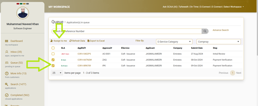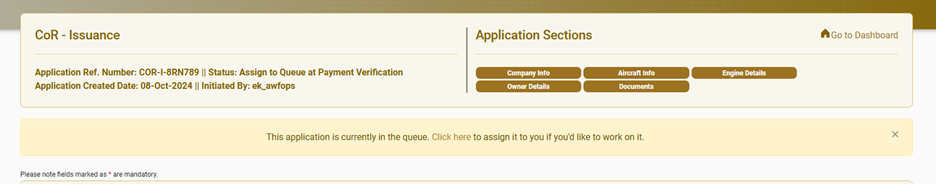 GCAA Employee can also assign the application from the Queue by opening the application from the Queue and click on “Click here” link in the information yellow box.
