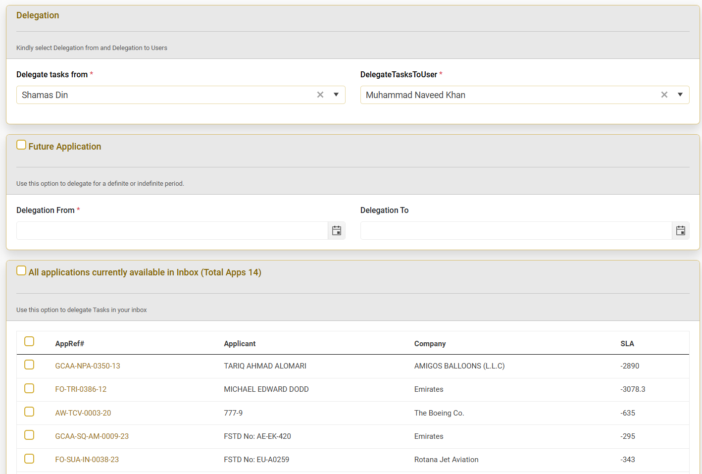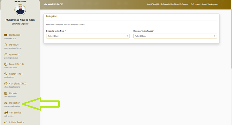 GCAA Employee can delegate the application by clicking on the delegate from the dashboard