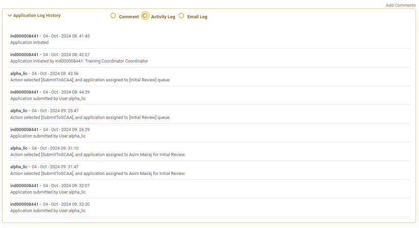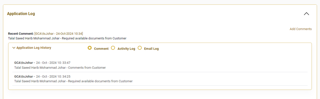 The system maintains a complete Comments History for communication within the application for full traceability