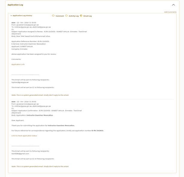 The system maintains a complete Email of all actions and updates within the application for full traceability.