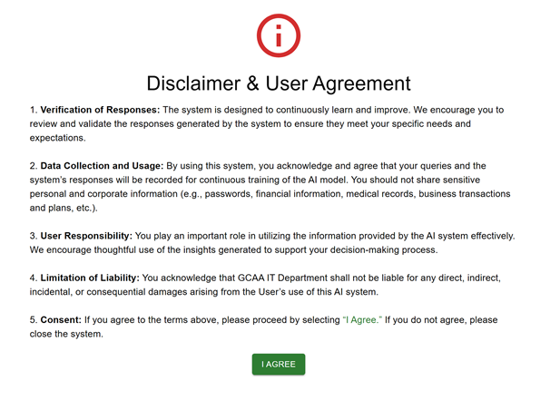 When you open Ask GCAA (AI), you’ll see the Disclaimer & User Agreement.